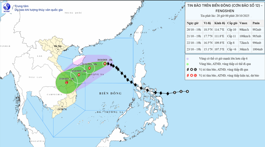 Dự báo đến 19 giờ ngày 21-10, bão số 12 trên vùng biển phía Bắc đặc khu Hoàng Sa, sức gió mạnh cấp 11, giật cấp 13, di chuyển theo hướng Tây, sau đổi hướng Tây Tây Nam, tốc độ khoảng 15 km/giờ và có khả năng mạnh thêm. Khu vực ảnh hưởng là Bắc Biển Đông (bao gồm đặc khu Hoàng Sa). Cấp độ rủi ro thiên tai cấp 3.