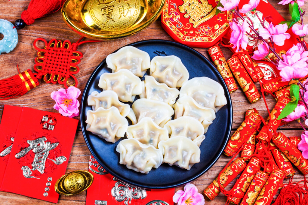 Tại Trung Quốc, ẩm thực ngày Tết gắn chặt với quan niệm “cát tường qua âm đọc”. Cá nguyên con xuất hiện trong bữa cơm tất niên và mùng Một bởi chữ “cá” (yú) đồng âm với “dư dả”, thể hiện mong ước năm mới sung túc. Sủi cảo được gói thành hình thỏi vàng cổ, thường ăn vào thời khắc giao thừa để cầu tài lộc. Mì trường thọ không bị cắt ngắn khi chế biến, tượng trưng cho cuộc sống dài lâu, còn các món bánh, kẹo mang sắc đỏ được ưa chuộng vì màu đỏ gắn với vận may và sự hưng thịnh.