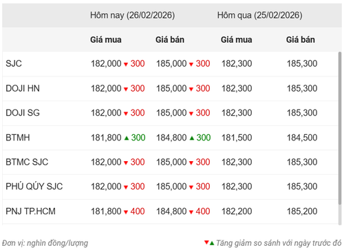 Giá vàng thế giới hôm nay (26/2) tăng mạnh trở lại, giao dịch ở mức 5.192,9 USD/ounce, trong bối cảnh nhà đầu tư đổ xô mua vàng trú ẩn. Trong nước, giá vàng miếng, vàng nhẫn SJC giảm 300 nghìn đồng/lượng, niêm yết lần lượt ở mức 185 triệu đồng/lượng và 184,5 triệu đồng/lượng. Vàng nhẫn Doji neo ở mức 184,9 triệu đồng/lượng.