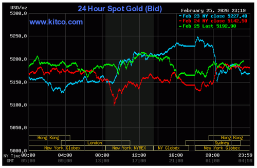 Tính đến 11 giờ 30 phút ngày 26/2 (giờ Việt Nam), giá vàng thế giới tăng 50,4 USD/ounce so kết phiên trước đó, lên mức 5.192,9 USD/ounce.