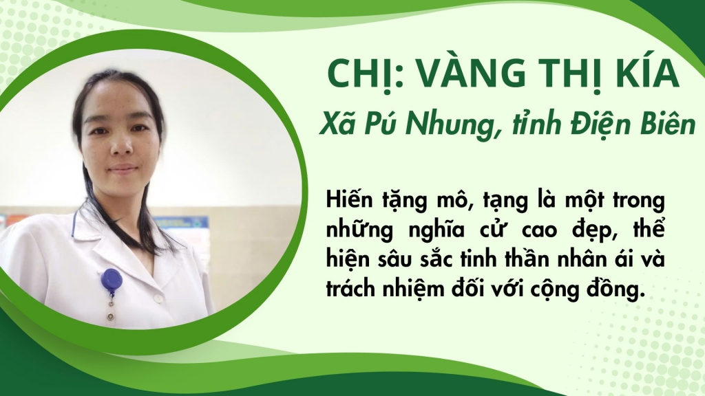 Tại xã vùng cao Pú Nhung, câu chuyện về hành trình đăng ký hiến tặng mô, tạng của chị Vàng Thị Kía, người dân tộc Mông, công tác tại Điểm trạm Quài Nưa, Trạm Y tế xã Tuần Giáo đã để lại nhiều cảm xúc. Ngay từ những năm còn học tại Trường Cao đẳng Y Thái Nguyên, khi được tiếp cận kiến thức về hiến tặng mô, tạng, chị Kía dần hiểu rõ giá trị của việc “cho đi” để cứu sống người khác. Với chị, hiến tạng là một hành động nhân đạo, cũng là cách trao đi cơ hội sống, tiếp nối những giá trị tốt đẹp cho cộng đồng. Từ nhận thức ấy, chị Kía nung nấu suy nghĩ hiến tặng mô, tạng để khi mình qua đời, cơ thể vẫn có thể tiếp tục “sống” theo một cách khác, mang lại hy vọng cho những người đang cần được sống.