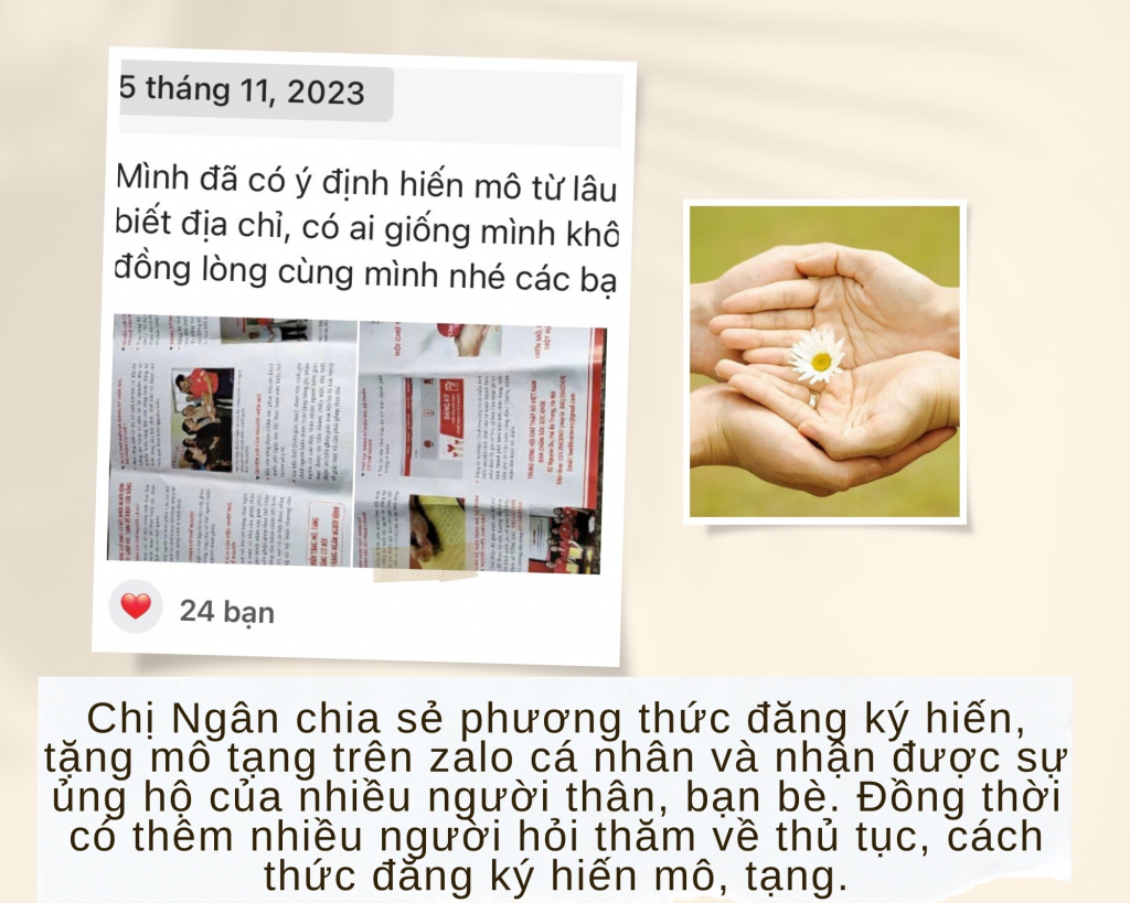 Từ lòng biết ơn sâu sắc, chị Ngân bắt đầu tìm hiểu về hiến tặng mô, tạng và càng hiểu rõ hơn ý nghĩa của việc “cho đi để giữ lại sự sống”. Sau nhiều suy nghĩ, chị quyết định đăng ký hiến tặng mô, tạng với mong muốn nếu một ngày không còn nữa, mình vẫn có thể giúp đỡ những người đang cần được sống. Không dừng lại ở bản thân, chị Ngân còn vận động người thân, bạn bè cùng tìm hiểu và tham gia. Đặc biệt, chồng chị hoàn toàn đồng hành, ủng hộ và cùng chị đăng ký hiến tặng.