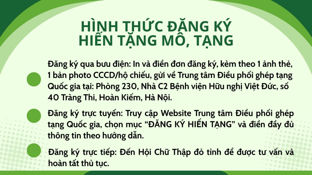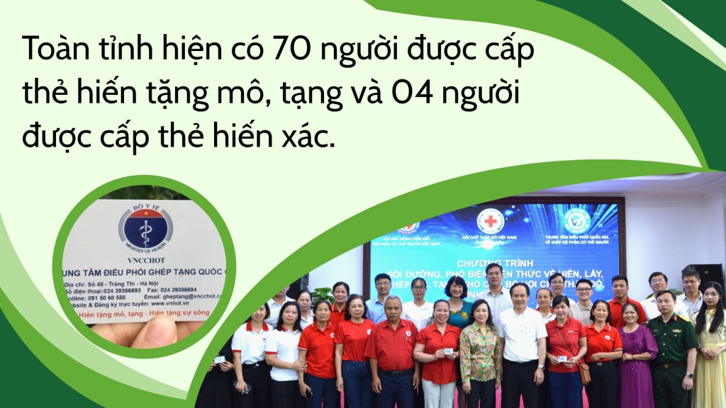Bằng nhiều giải pháp đồng bộ, nhận thức của người dân trên địa bàn tỉnh đã có những chuyển biến rõ rệt. Ngày càng nhiều người chủ động tìm hiểu, đăng ký hiến tặng mô, tạng sau khi qua đời. Nhiều trường hợp trực tiếp đến bệnh viện để được tư vấn và hoàn tất thủ tục. Đến nay, toàn tỉnh đã có 70 người được cấp thẻ đăng ký hiến tặng mô, tạng và 4 người được cấp thẻ hiến xác cho y học.