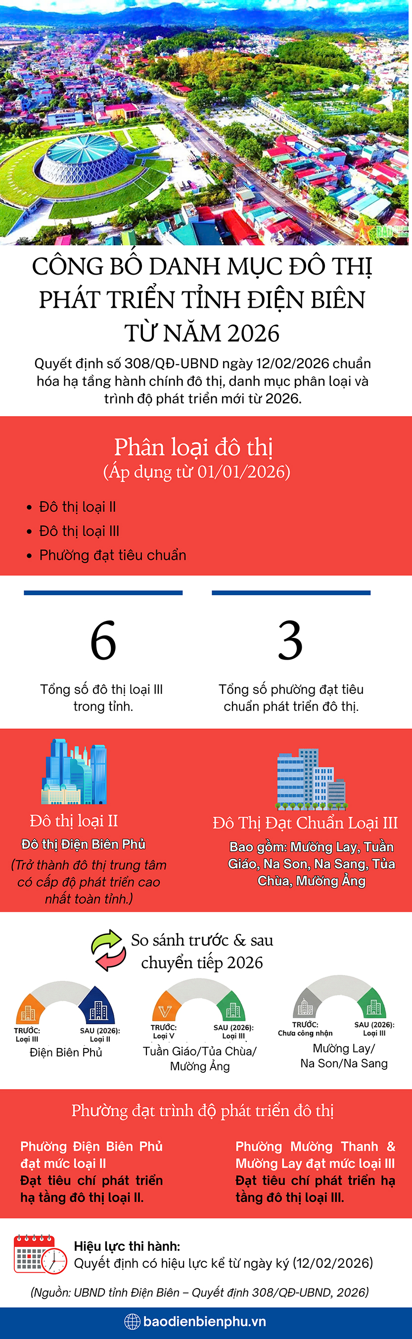 ĐBP - UBND tỉnh ban hành Quyết định số 308/QĐ-UBND ngày 12/2/2026 công bố danh mục đô thị, phường đạt mức quy định trình độ phát triển đô thị trên địa bàn tỉnh. Theo đó, đô thị Điện Biên Phủ được xác định là đô thị loại II; 6 đô thị gồm Mường Lay, Tuần Giáo, Na Son, Na Sang, Tủa Chùa, Mường Ảng là đô thị loại III; đồng thời công bố các phường đạt trình độ phát triển đô thị tương ứng.