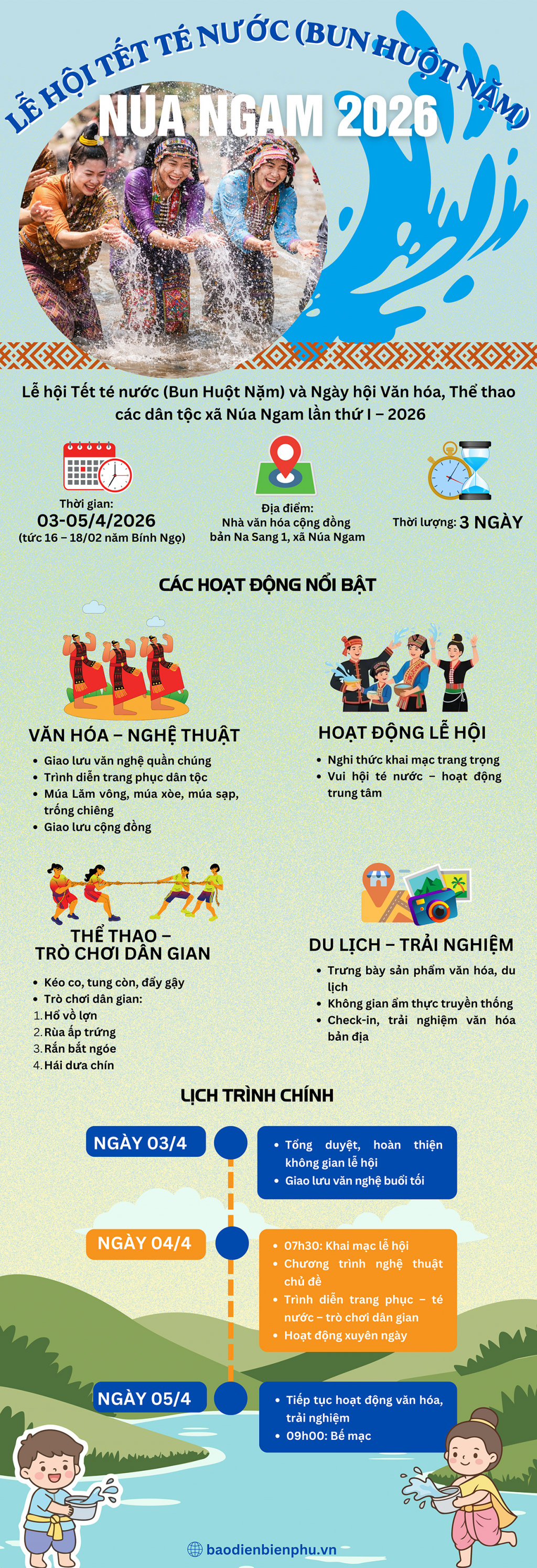 ĐBP - Lễ hội Tết té nước (Bun Huột Nặm) gắn với Ngày hội văn hóa, thể thao các dân tộc xã Núa Ngam lần thứ I năm 2026 là hoạt động văn hóa có ý nghĩa thiết thực, nhằm bảo tồn và phát huy những giá trị truyền thống tốt đẹp của đồng bào các dân tộc, đặc biệt là dân tộc Lào trên địa bàn. Với nhiều nội dung phong phú như nghi lễ truyền thống, hoạt động văn hóa, thể thao, dân gian đặc sắc, sự kiện hứa hẹn sẽ tạo không khí vui tươi, phấn khởi trong Nhân dân. Đây cũng là dịp quảng bá hình ảnh vùng đất, con người Núa Ngam, từng bước thúc đẩy phát triển du lịch, kinh tế – xã hội địa phương.