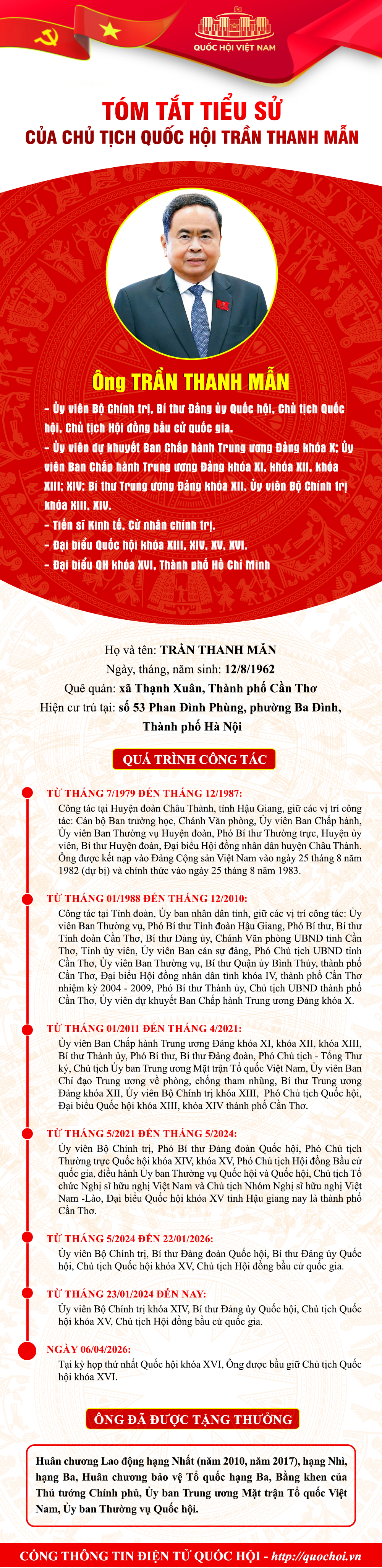 ĐBP - Sáng 6/4, tại Kỳ họp thứ nhất, Quốc hội khóa XVI đã bầu đồng chí Trần Thanh Mẫn, Ủy viên Bộ Chính trị, Chủ tịch Quốc hội khóa XV, đại biểu Quốc hội khóa XVI giữ chức Chủ tịch Quốc hội nước Cộng hòa xã hội chủ nghĩa Việt Nam khóa XVI. Báo và phát thanh, truyền hình Điện Biên trân trọng giới thiệu Tiểu sử tóm tắt của Chủ tịch Quốc hội khóa XVI Trần Thanh Mẫn.