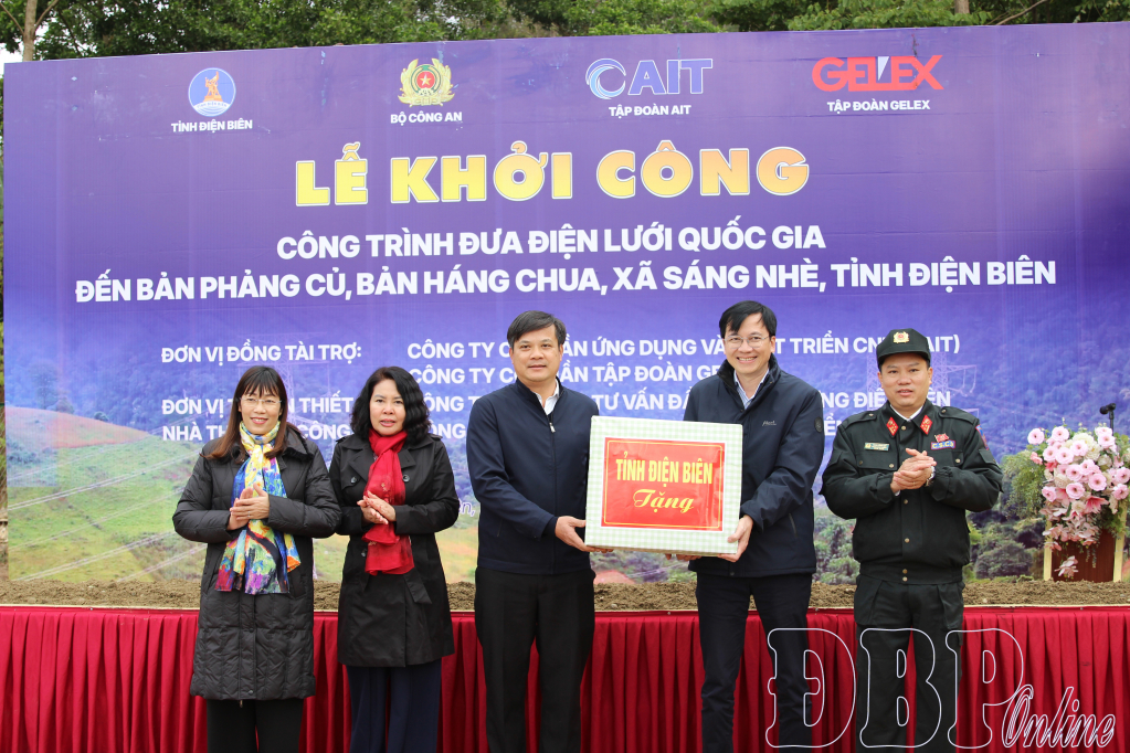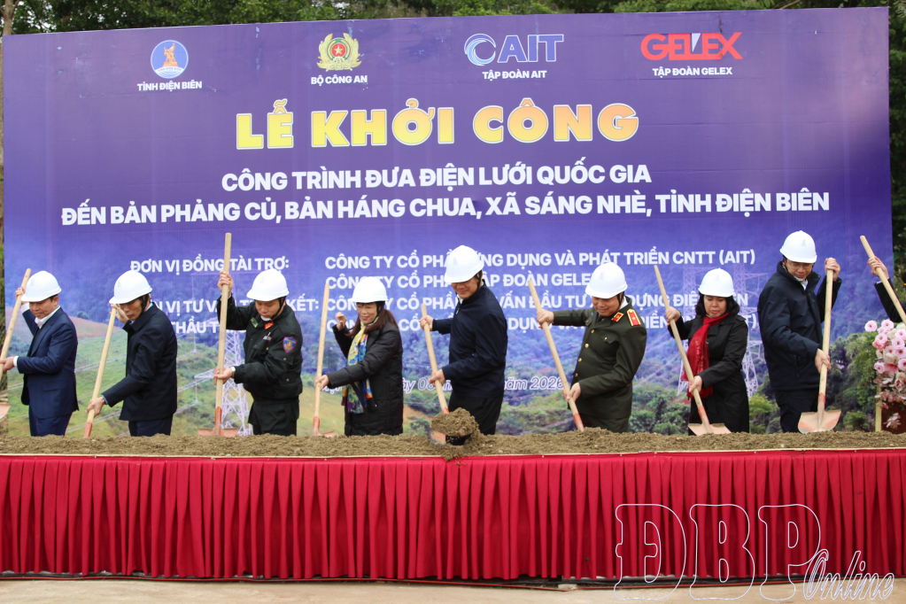 ĐBP - Sáng 8/1, Bộ Công an phối hợp với tỉnh Điện Biên tổ chức khởi công công trình đưa điện lưới quốc gia đến 2 bản: Phảng Củ và Háng Chua, xã Sáng Nhè. Dự lễ khởi công có các đồng chí: Cao Thị Tuyết Lan, Ủy viên BTV Tỉnh ủy, Phó Chủ tịch HĐND tỉnh; Lò Thị Minh Phượng, Ủy viên BTV Tỉnh ủy, Phó Chủ tịch Thường trực Ủy ban MTTQ Việt Nam tỉnh; Lò Văn Cương, Ủy viên BTV Tỉnh ủy, Phó Chủ tịch Thường trực UBND tỉnh cùng lãnh đạo một số sở, ngành tỉnh.