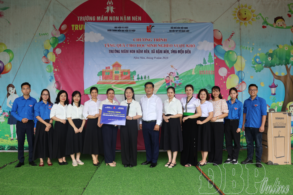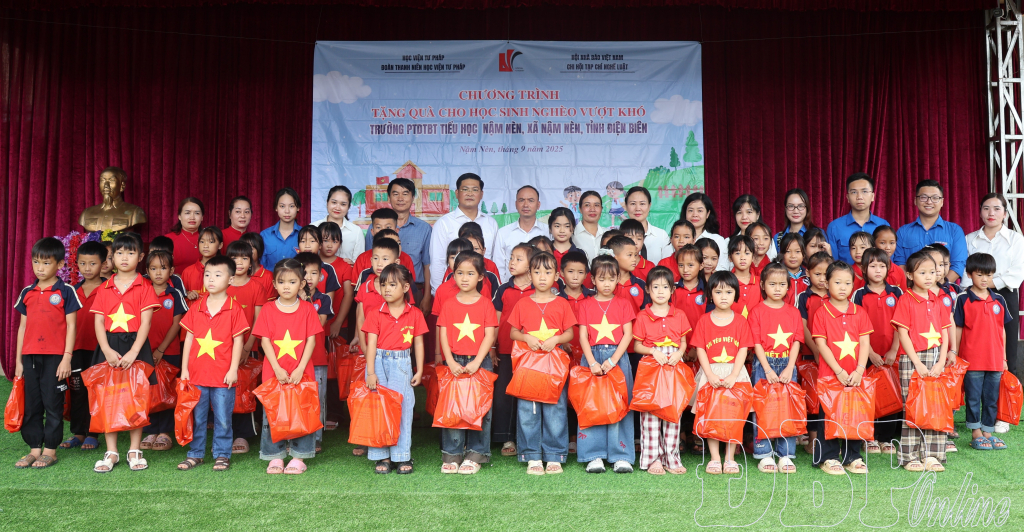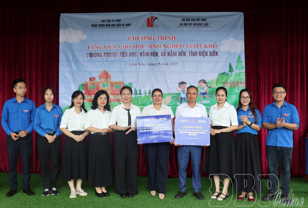 Tại đây, đoàn công tác đã tặng học sinh các trường: Phổ thông dân tộc bán trú Tiểu học Nậm Nèn, Phổ thông dân tộc bán trú Tiểu học Huổi Mí, Mầm non Nậm Nèn, Mầm non Huổi Mí 300 cờ Tổ quốc; 5 máy lọc nước; gần 1.000 balo; hơn 7.800 quyển vở; gần 1.500 quyển truyện tranh, sách, báo pháp luật; 571 áo phông; 285 bộ chăn gối màn, cùng nhiều đồ dùng học tập (bút, thước, mực, bảng, kéo, đồ chơi xếp hình...), đồ dùng sinh hoạt cá nhân.
