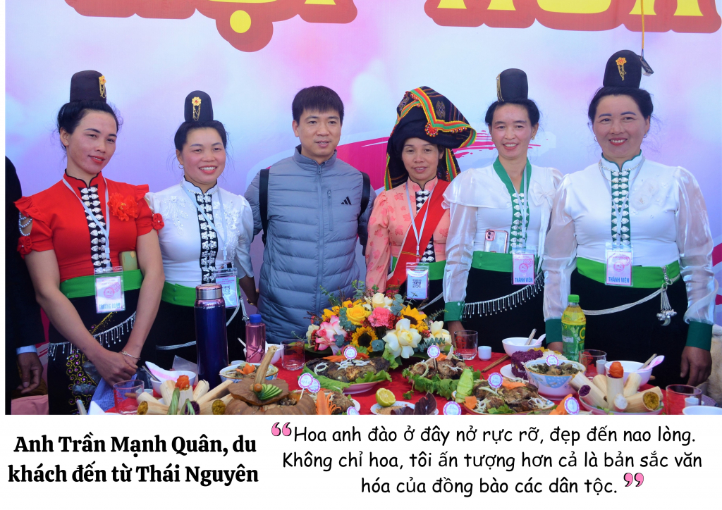 Lần đầu đến Mường Phăng đúng dịp lễ hội, anh Trần Mạnh Quân, du khách đến từ Thái Nguyên chia sẻ: Hoa anh đào ở đây nở rực rỡ, đẹp đến nao lòng. Cùng với hoa anh đào, tôi còn ấn tượng với bản sắc văn hóa của đồng bào các dân tộc Mường Phăng. Tôi được thưởng thức một số món ăn truyền thống, thấy rất ngon và độc đáo, cảm nhận rõ sự thân thiện, mến khách của người dân nơi đây.