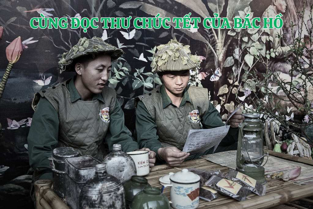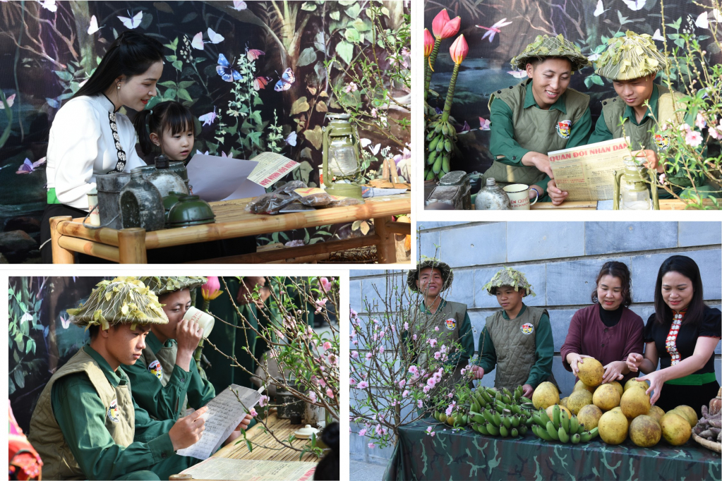 Không gian “Tết chiến sĩ Điện Biên – Xuân 1954” được thiết kế mộc mạc nhưng ấm áp, gợi lại hình ảnh bộ đội và dân công giữa chiến hào năm xưa. Tại đây, mỗi chi tiết như một thông điệp kể lại câu chuyện về đời sống tinh thần bền bỉ của người lính Điện Biên. Từ chiếc xe đạp thồ, hòm đạn, bi đông sờn màu, ca sắt, cùng lán trại dã chiến… Đặc biệt, màn tái hiện đọc thư Bác Hồ gửi cán bộ và chiến sĩ mặt trận Điện Biên Phủ đã để lại dấu ấn đầy xúc động về ngày Tết ở chiến trường.