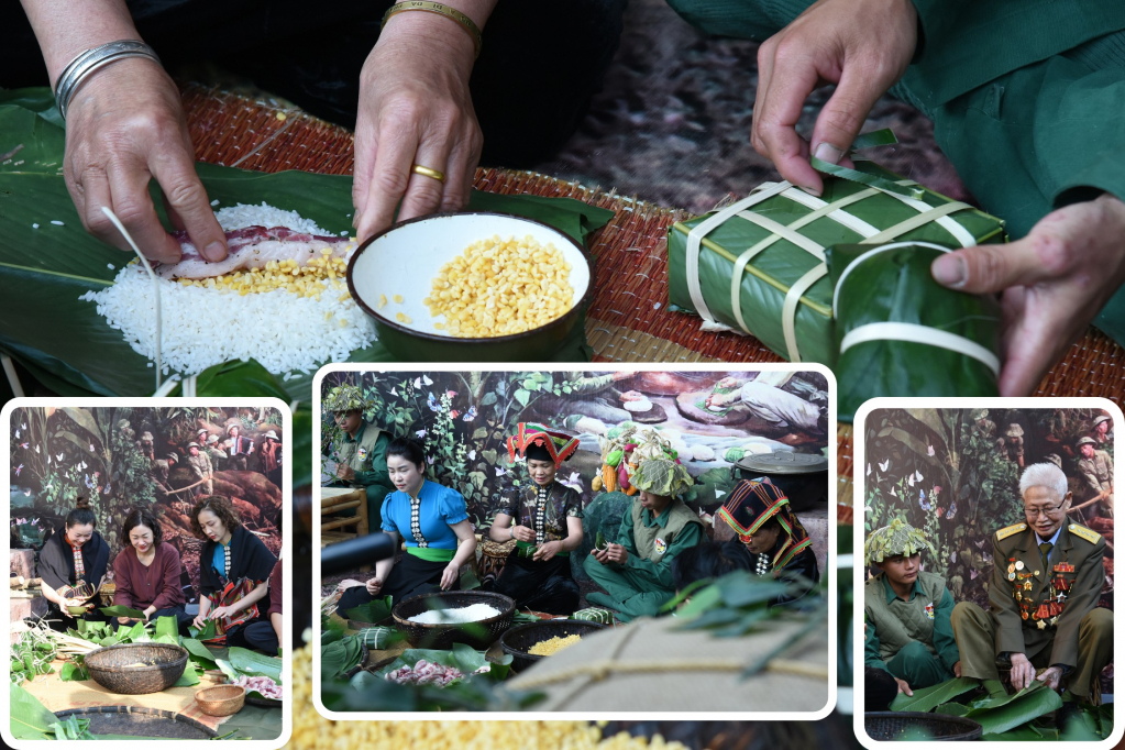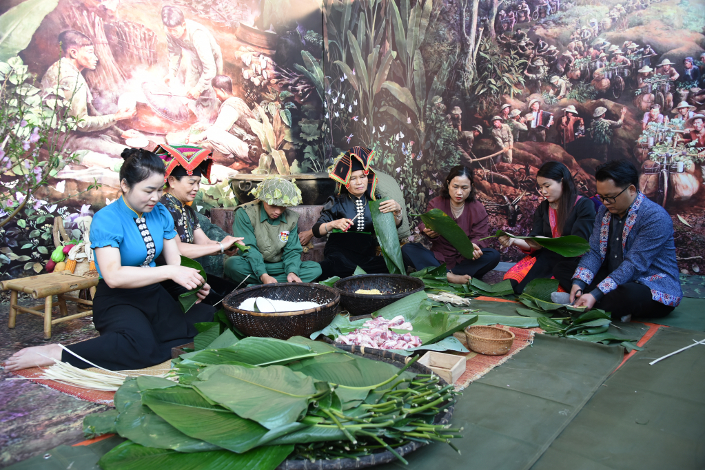 Giữa không gian mang đậm giá trị lịch sử, hình ảnh bộ đội, dân công và đồng bào các dân tộc Tây Bắc quây quần bên những chiếc bánh chưng, bánh gù như kéo gần khoảng cách giữa quá khứ và hiện tại.