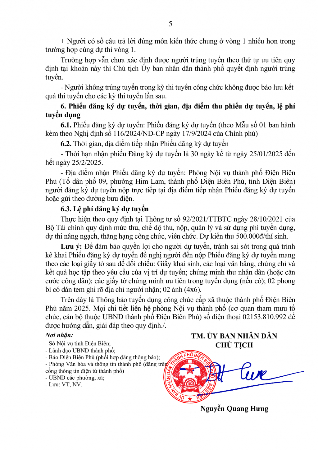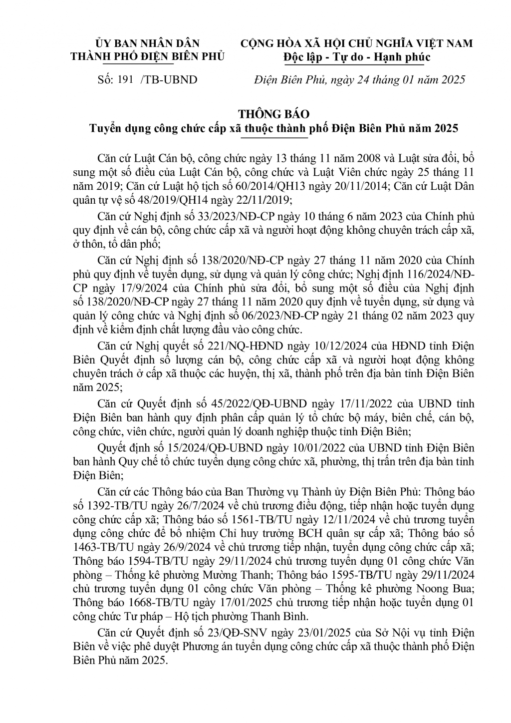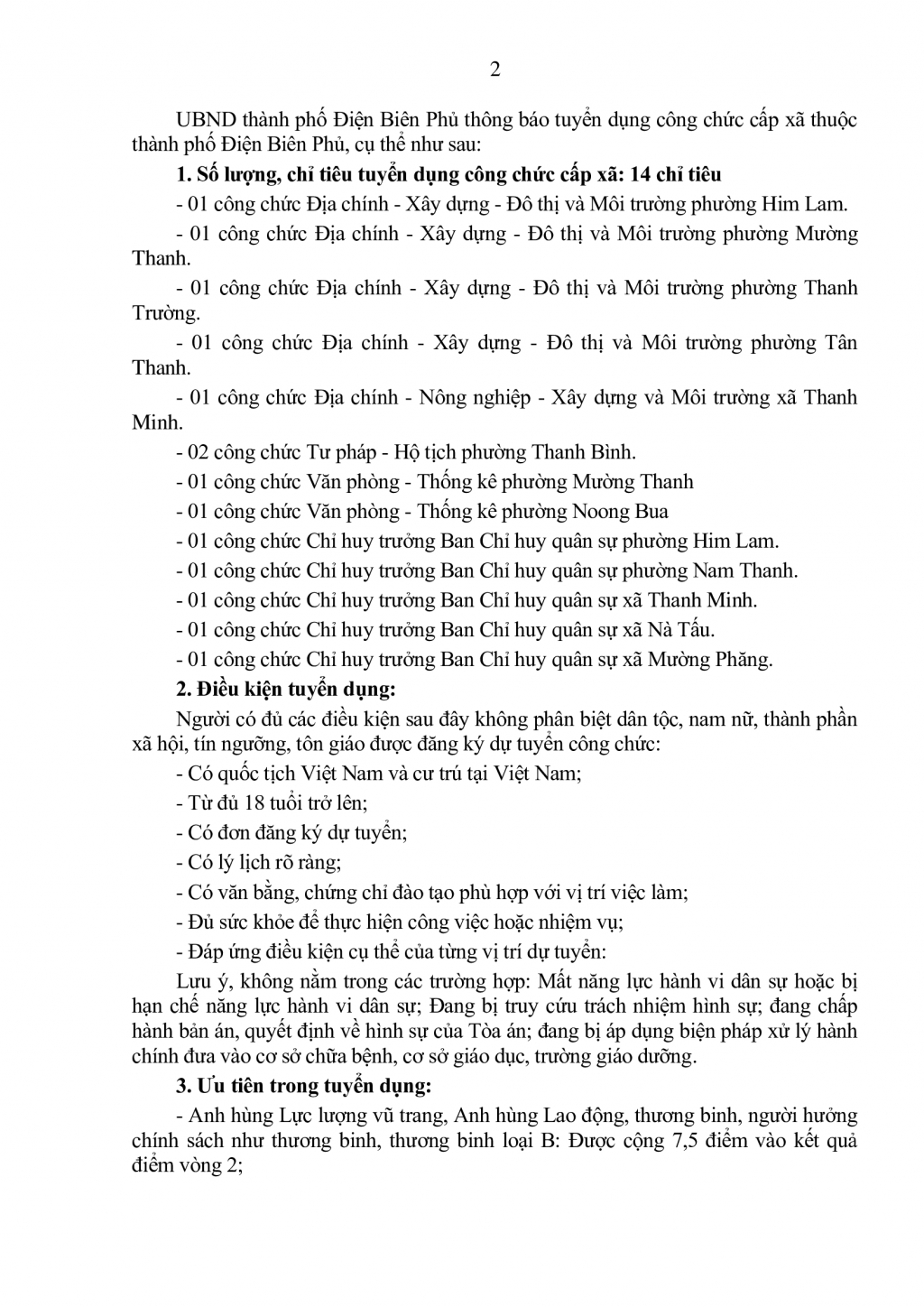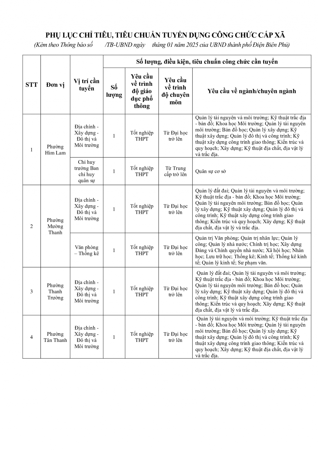 Thông báo tuyển dụng công chức cấp xã thuộc thành phố Điện Biên Phủ năm 2025