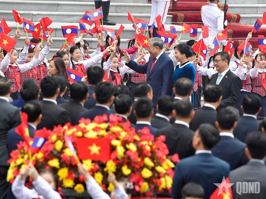 Tổng Bí thư Tô Lâm trân trọng mời Tổng Bí thư, Chủ tịch nước Lào Thongloun Sisoulith bước lên bục danh dự. Những loạt đại bác vang lên hùng tráng. Quân nhạc cử quốc thiều hai nước. Tổng Bí thư Tô Lâm mời Tổng Bí thư, Chủ tịch nước Lào Thongloun Sisoulith duyệt Đội danh dự Quân đội nhân dân Việt Nam. Sau duyệt đội danh dự, Tổng Bí thư Tô Lâm và Tổng Bí thư, Chủ tịch nước Lào Thongloun Sisoulith giới thiệu các thành viên đoàn đại biểu cấp cao hai nước tại lễ đón.