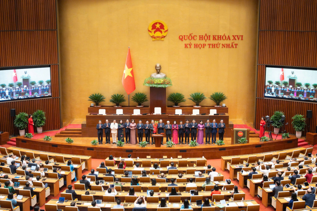 Hình ảnh các đồng chí mới được Quốc hội bầu giữ chức vụ Chủ tịch Quốc hội, Chủ tịch nước, Thủ tướng Chính phủ, Chánh án Tòa án nhân dân tối cao đứng trước Quốc kỳ, tay đặt lên Hiến pháp và tuyên thệ đã trở thành khoảnh khắc thiêng liêng nhất của tuần làm việc đầu tiên Kỳ họp thứ Nhất, Quốc hội khóa XVI: "Dưới cờ đỏ sao vàng thiêng liêng của Tổ quốc, trước Quốc hội và đồng bào cử tri cả nước, tôi xin thề: Tuyệt đối trung thành với Tổ quốc, với Nhân dân, với Hiến pháp nước Cộng hòa xã hội chủ nghĩa Việt Nam..."
